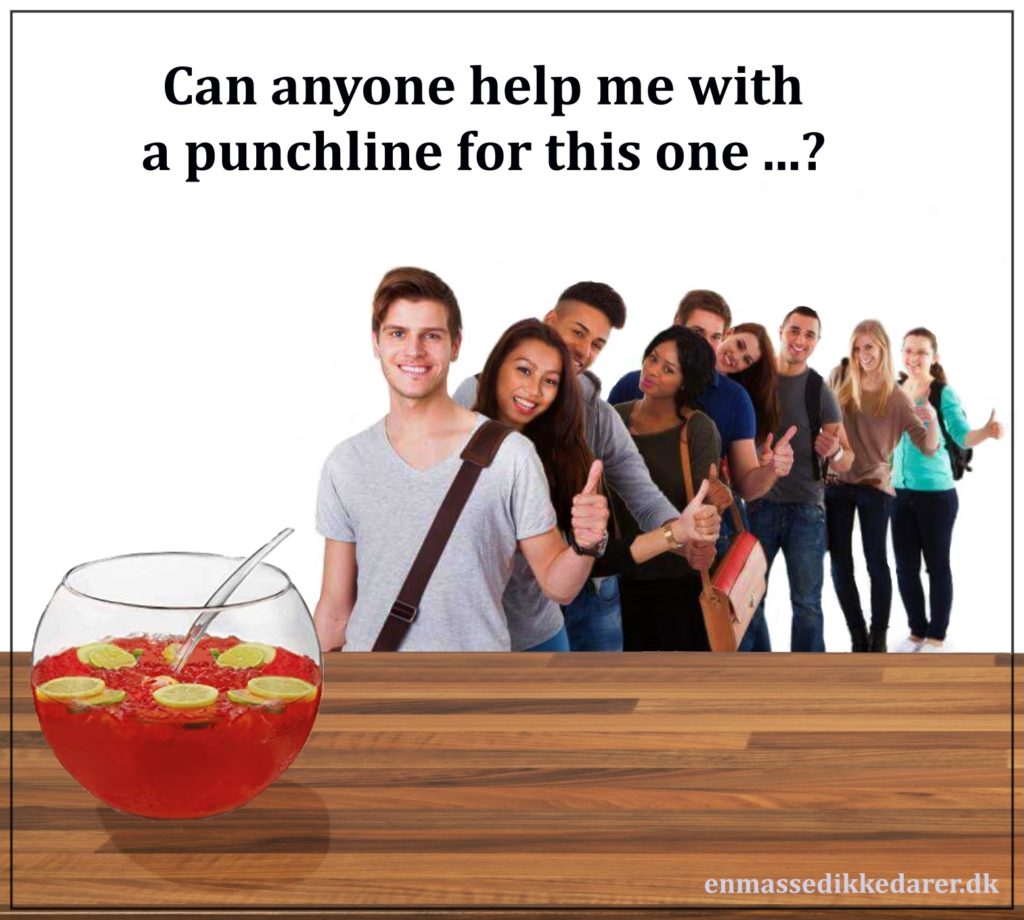 Punchline Share Email Det er ikke altid så let at finde på en god punchline. Men lokker du med lidt alkohol – så er hjælpen altid nær! Share Email