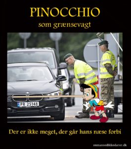 Nu får vi grænsekontrol for rejsende fra Sverige til Danmark. "Velkommen til Danmark! Heja Sverige!" (Eller hva' synes du Pinocchio skal sige, for at bommen skal være effektiv ...?) … [Læs mere...] om Pinocchio som bomvagt